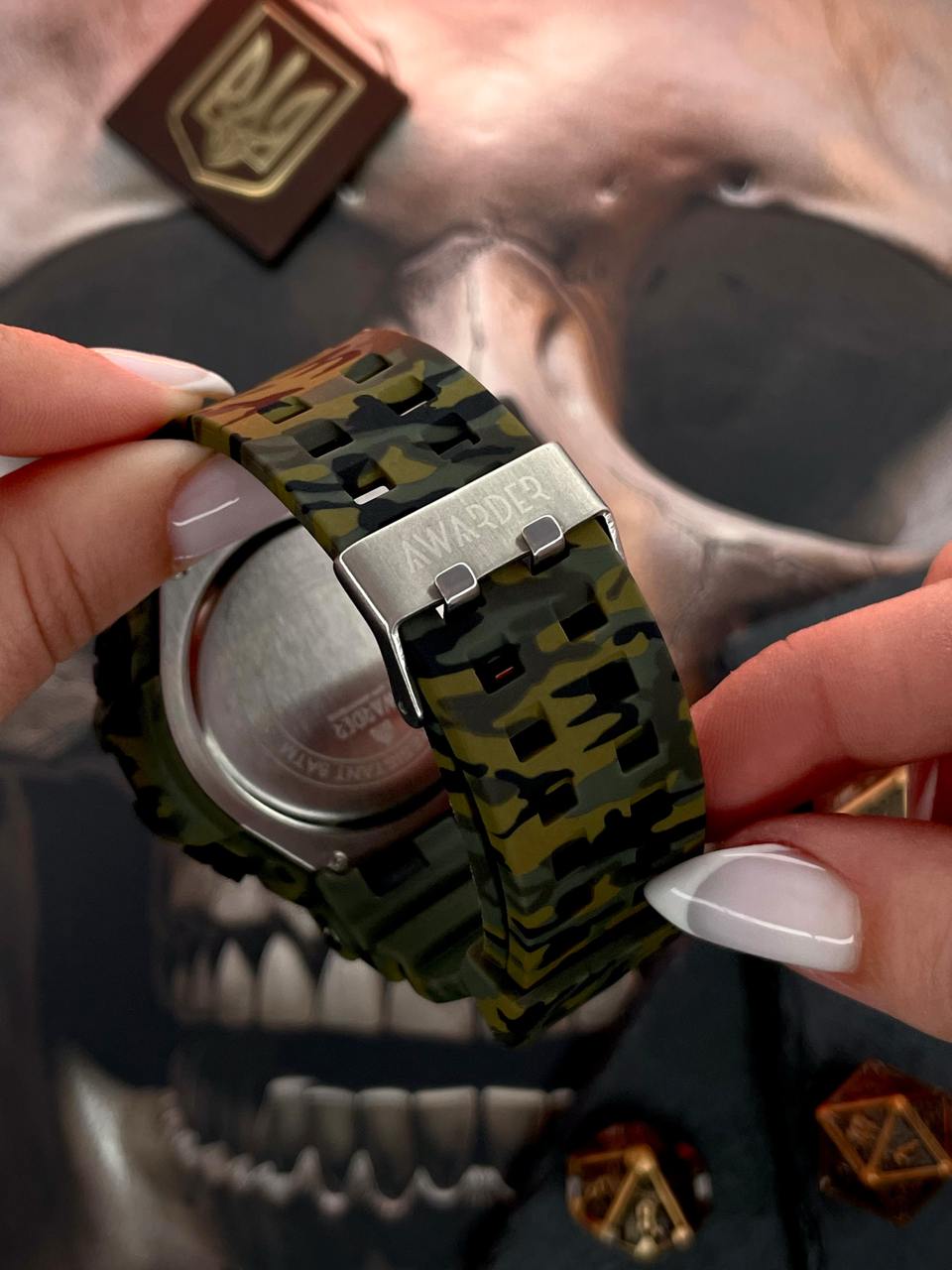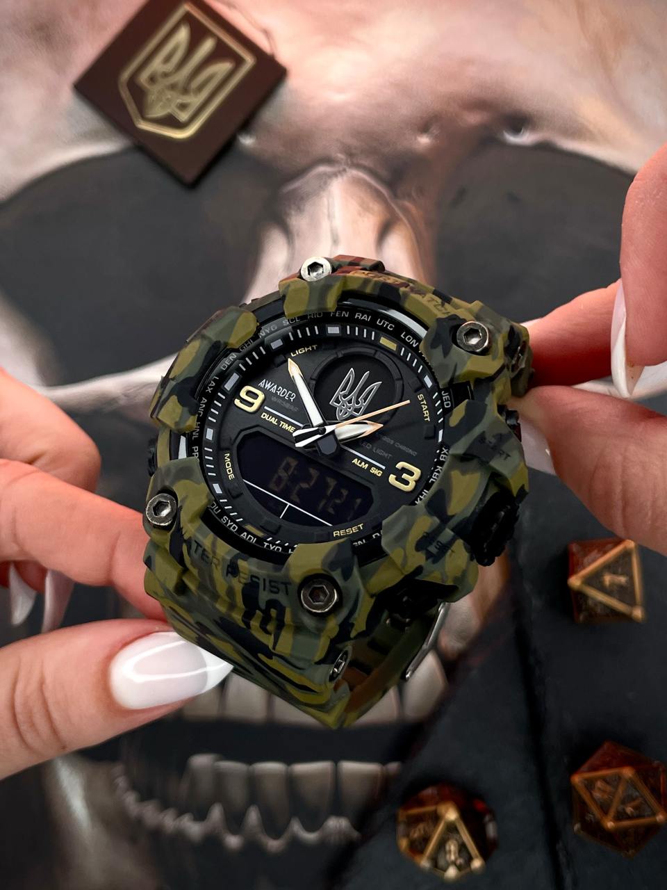 Awarder 001 Тризуб срібло Camo Green — годинник, що виглядає так, ніби створений не для офісу, а для виживання в посадках. Масивний корпус 50 мм і зелений «камо» дизайн кричать «мілітарі», навіть якщо твій єдиний марш-кидок — винос мусору. Водозахист 5 ATM дозволить не боятися дощу, але не виправдає пірнання у річку «на слабо». А підсвітка допоможе бачити час навіть у темряві, коли твій телефон уже вкотре розрядився.