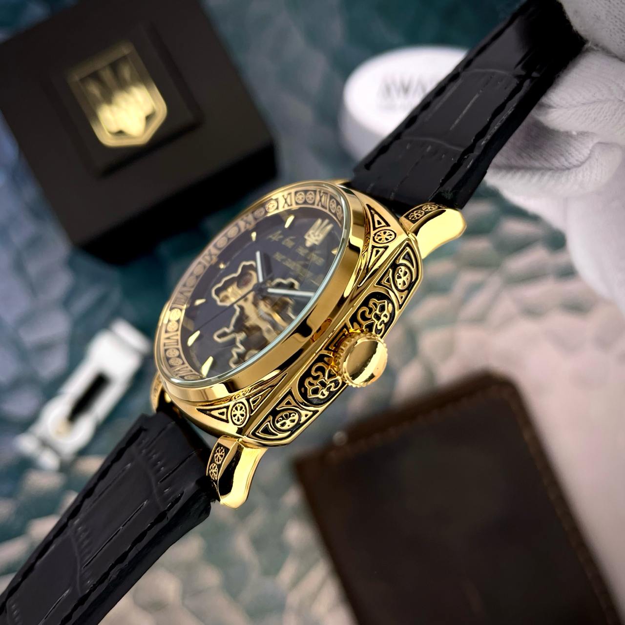 Awarder 021-3D «Де би не був» Gold-Black — годинник, який виглядає так, ніби ти зібрався на важливу зустріч, навіть якщо йдеш просто винести мусор Чорний циферблат додає серйозності, а золотий корпус блищить так, ніби в тебе десь є офшори. Шкіряний ремінець зручний і надійний — тримає руку краще, ніж ти тримаєш обіцянку більше не пити. Автопідзавод працює від руху, тому будь спокійний: навіть похід до холодильника офіційно зараховується як активність.