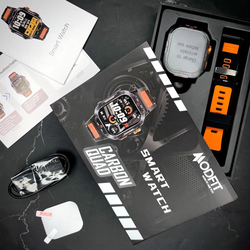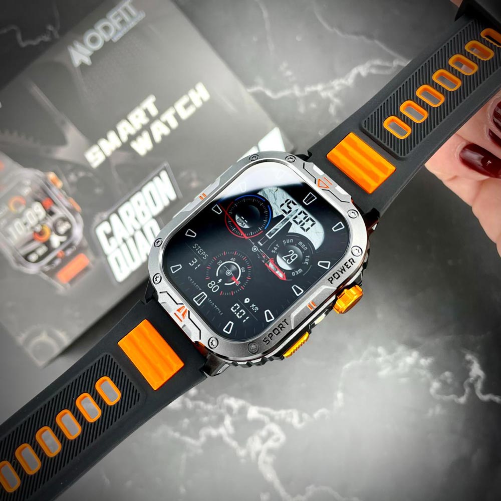Modfit Carbon Quad Orange  – помітний, як попа ногастої тьолки. Він міряє пульс, сон і кроки, а от зарплату рахувати відмовляється. Бо рже як кінь. Дисплей яскравий, як мигалки патруля, коли ти без страховки.