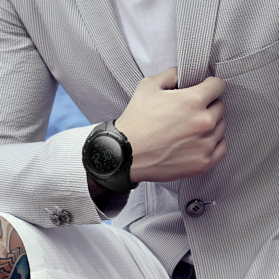Годинник Skmei 1326BK Black – для занять спортом. Має всі функції смарт-годинника і фітнес браслету. Але без необхідності постійного заряджання. Батарея служить 1 рік. Годинник вимірює основні показники тіла, відстань, нагадує про дзвінки, віддалене управління камерою (підключається до смартфона через Bluetooth). Основна відмінність від смарт годиника в тому, що у цього годинника не сенсорний екран, а звичайний електронний циферблат. Налаштування можна здійснити в додатку смартфона або кнопками. Показники годинник може відображати самостійно без підключення до смартфона з оновленням кожної доби.