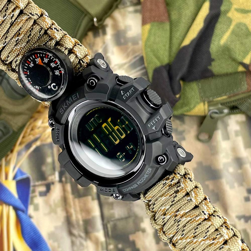 SKMEI 1356DCPK також дарує можливість підсвічування дисплея, різний формат відображення часу (12/24 години) та важливі додаткові функції: свисток, кремінь, мотузка, компас і термометр. Це доповнюється регульованим паракордовим ремінцем, що надає вам змогу підігнати його під власні потреби.